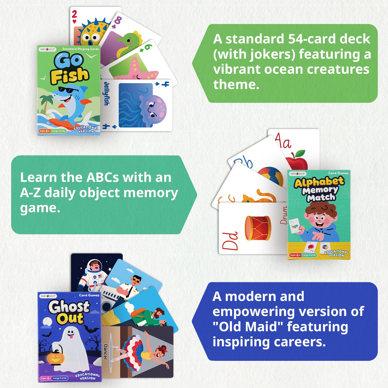 6 in 1 Educational Kids Card Games, Large Cards, Alphabet Memory Match, Slap Jack, Go Fish, Crazy Eights, War, Ghost Out (Formerly Old Maid)