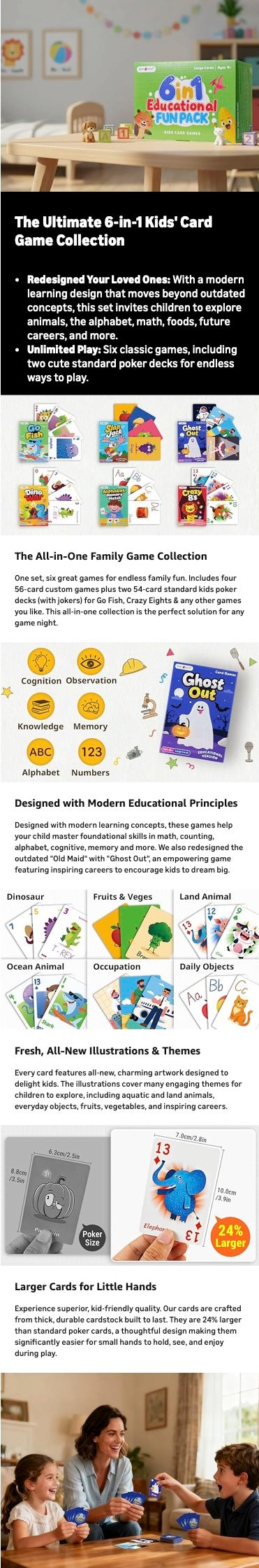 - Larger Card Size for Little Hands: This educational version features cards sized at 2.75" x 3.95" (70 x 100mm), which is 24% bigger than standard playing cards. This larger format is easier for small hands to hold, see, and manage, which fosters confidence and independent play.